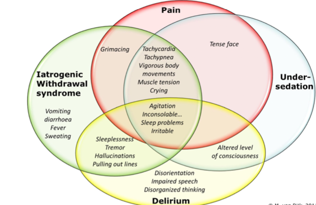 This Delphi study is the first step in developing a 4-in-1 comprehensive checklist to assess pain, undersedation, iatrogenic withdrawal syndrome and delirium in a holistic manner.